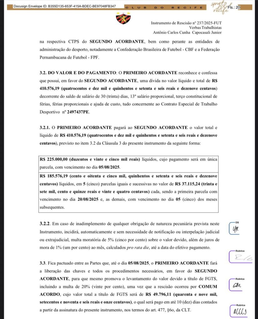 O valor total definido entre as partes foi de R$ 410.576,19, incluindo salário atrasado, 13º proporcional, férias e terço constitucional, além de ajuda de custo. De acordo com o jogador, a primeira parcela, que deveria ter sido quitada em agosto, só foi paga no início de outubro e, de lá pra cá, nenhum outro depósito foi feito.