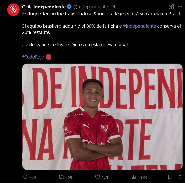 O Sport está muito próximo de oficializar a contratação do meia argentino Rodrigo Atencio, em um dos negócios mais comentados do mercado. Embora o clube ainda não tenha feito o anúncio oficial, o Independiente já confirmou a transferência por meio de suas redes sociais. A negociação envolve 80% dos direitos do jogador, com os 20% restantes mantidos pela equipe argentina.