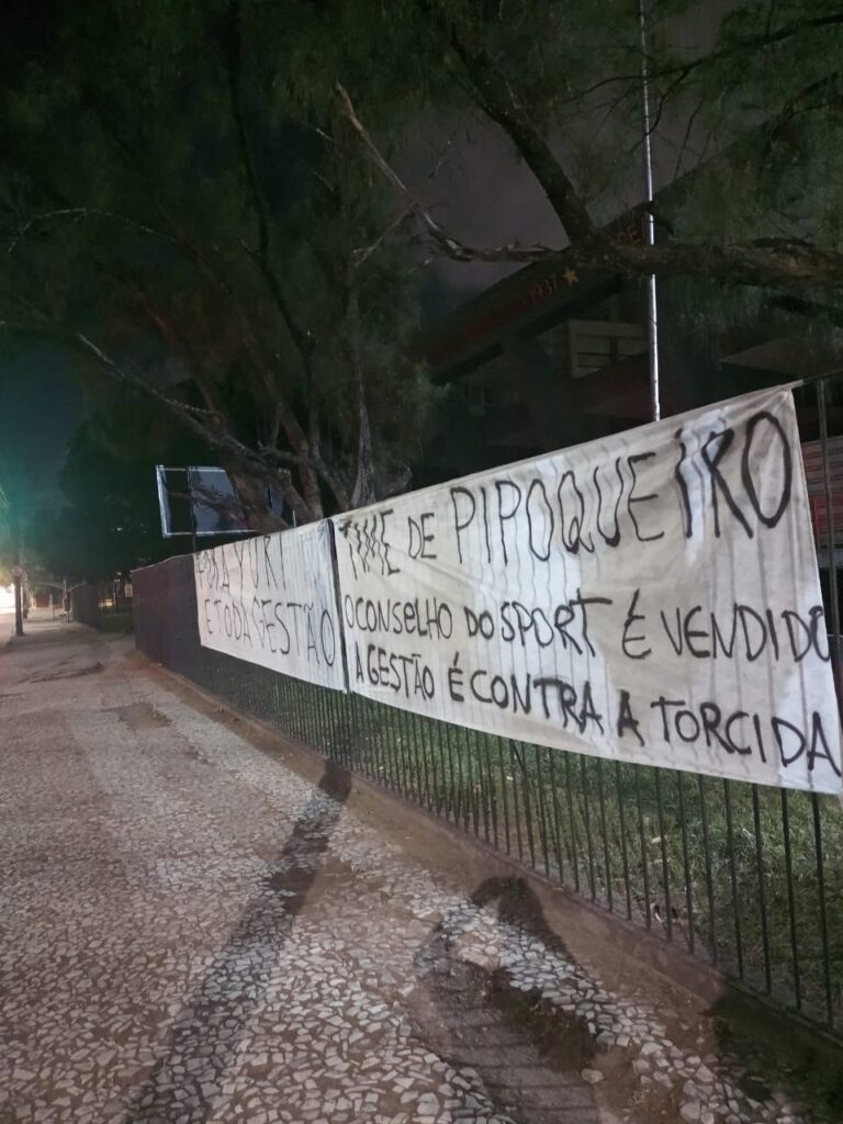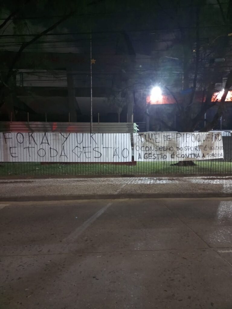 Faixas foram colocadas nas grades e muros do estádio com mensagens diretas: “Fora Yuri e toda gestão”, “Time de pipoqueiro” e “Conselho do Sport é vendido. A gestão é contra a torcida”.