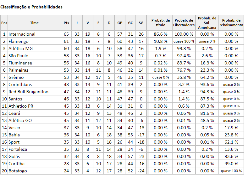 Botafogo, Coritiba e Goiás estão com mais de 80 % de chances de queda, segundo os especialistas. Se o Campeonato Brasileiro acabasse nesta quinta-feira (04), Botafogo (20°), Coritiba (19°), Goiás (18°) e Fortaleza (17°) estariam rebaixados, pois são os últimos na tabela. Lembrando que ainda faltam 5 rodadas para o fim da competição, que se encerra em fevereiro.